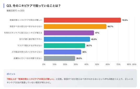 その結果、「乾燥対策とニキビケアの両立が難しい」が72.3%で最多となり、次いで「保湿すべきか控えるべきかわからない」(58.7%)、「冬用のスキンケアに変えるとニキビが増える」(47.0%)という結果になりました。