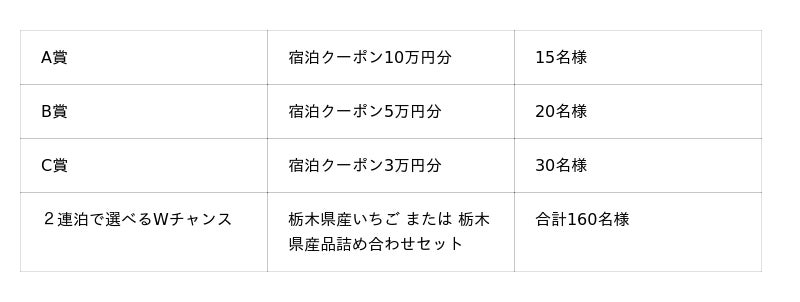 2025年12月1日(月)~2026年2月27日(金)の期間に栃木県内のホテルや旅館で宿泊し、本キャンペーンへご応募いただいたお客様へ抽選で、次回のとちぎ旅で使える10万円分の宿泊クーポン等をプレゼントいたします。