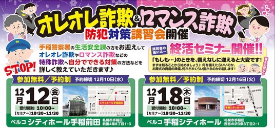 株式会社ベルコ 東札幌支社(札幌市手稲区)は、地域の安心安全な暮らしを支援する取り組みとして、2025年12月12日(金)および12月18日(木)の2日間に、「オレオレ詐欺・ロマンス詐欺 防犯対策講習会」を開催します。手稲警察署 生活安全課の担当者を講師に招き、実際に多発している詐欺の最新手口や、自分でできる防犯対策について具体的に解説します。