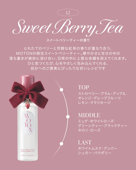 ヘアケア・ボディケアアイテムが大人気のMOTONから、とれたてのベリーと芳醇な紅茶の香りが重なり合う「SWEET BERRY TEA」の香りが数量限定で登場します。
