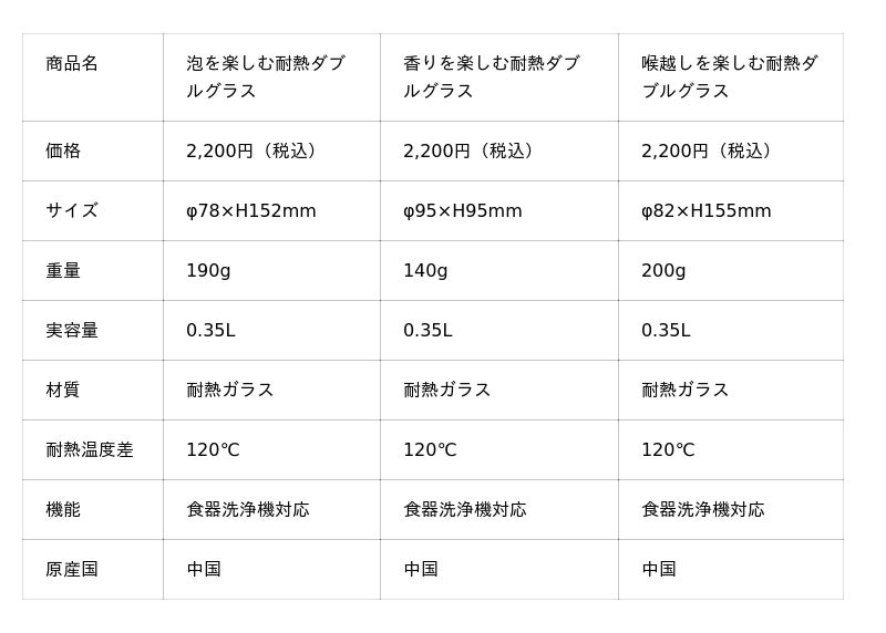 グラスはすべてダブルウォール構造で、温度を穏やかにキープ。