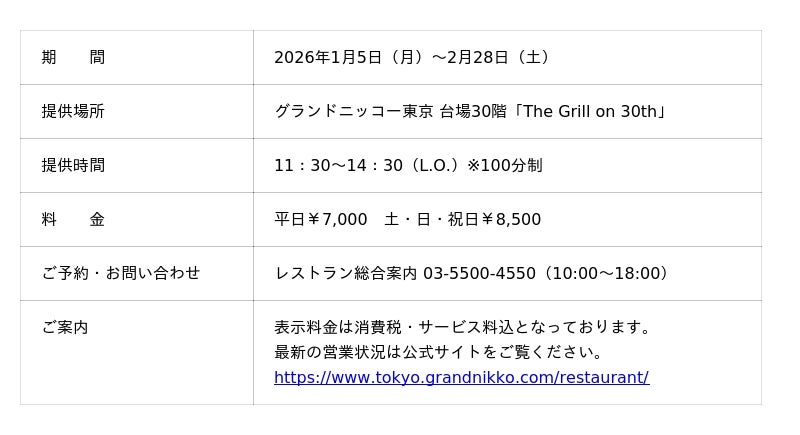 「東京を楽しむ 東京をくつろぐ」ひとときをお届けするグランドニッコー東京 台場(住所:東京都港区 総支配人:塚田 忠保)は、ホテル最上階から東京湾の美しい景色を望む「The Grill on 30th」にて、2026年1月5日(月)~2月28日(土)の期間、旬のいちごデザートブッフェを含む贅沢な『冬のプリフィックスランチ』を提供します。