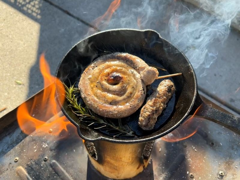 フレッシュハーブを混ぜ込んだ豚肉のタネを腸詰めして焚火で焼き上げる「ハーブ香るソーセージづくり」を開催します。自分の手で収穫したセージを混ぜ込むタネづくり、ソーセージメーカーを使った腸詰め、火起こし、焼き上げまでを体験できます。スウェーデントーチの焚火で焼き上げます。