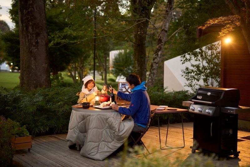 「冬の選べる鍋・房総の幸プラン」では、お部屋前のプライベートテラスにコタツ付きダイニングテーブルを設置し、外の澄んだ空気を感じながらも、ぬくもりに包まれた心地よい空間でアウトドアディナーを楽しむ、寒い季節だからこそ楽しめるアウトドア体験を提供します。
