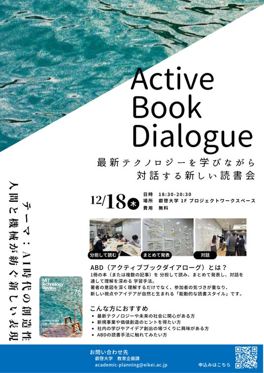 叡啓大学(学長:有信睦弘、広島市中区)は、2025年12月18日(木)、叡啓大学プロジェクトワークスペースにて、 最新テクノロジーを学びながら対話する読書会「ABD(アクティブブックダイアローグ)by Eikei Project Work Space」を開催します。