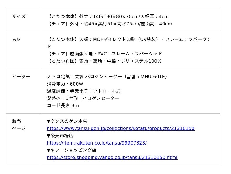 本製品はテーブル・こたつ布団・チェアのセット販売になります。