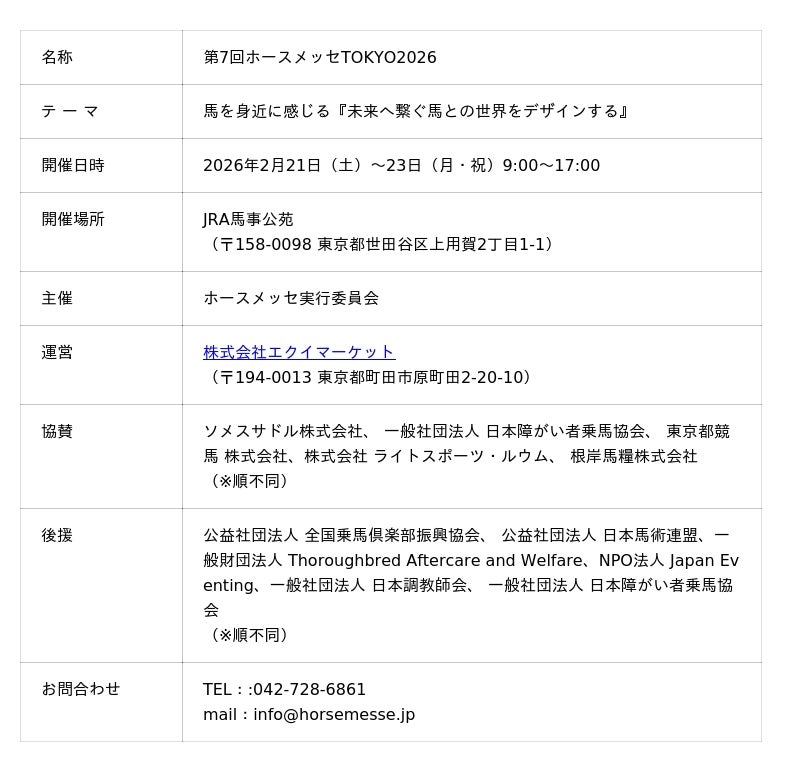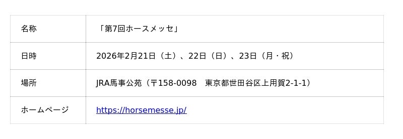 2年に1度開催されている日本最大級の馬の祭典「ホースメッセ」、第7回となる今回も「馬を身近に感じる」というキーワードのもと、様々な方面から馬に関するモノやコトが大集合!