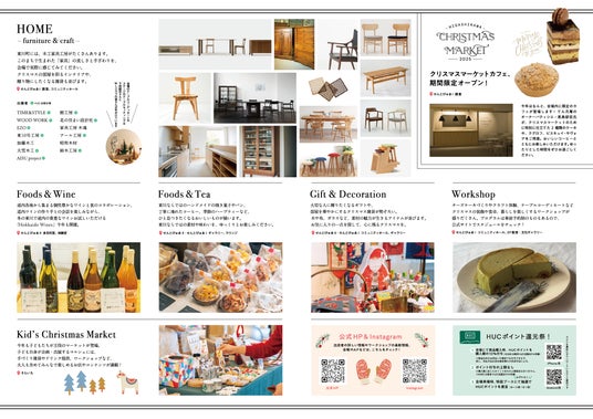 東川町では、町の主要産業である家具産業の振興、町内経済の活性化を目指し、2022年から本イベントを開催しています。会場は町の中心部にある、複合交流施設せんとぴゅあI・IIに加えて、東川町文化ギャラリー・東川町共生プラザそらいろを使用して実施。町内の木工家具事業者によるインテリア展のほか、美味しい飲食店の焼菓子やパンなどのフード・ドリンク販売にクリスマスのデコレーションやギフトアイテムが勢揃い。道内ワイン生産者によるワインの販売、子どもから大人まで楽しめるワークショップなど今年も約100店舗が出展し、東川町のクリスマスを盛り上げます。また、町内のデジタル地域通貨である「HUC(ひがしかわユニバーサルカード)」と連動した特別企画も実施いたします。