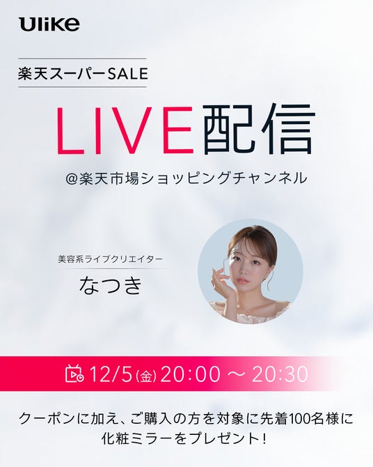 また、12月5日(金)20時00分~20時30分に「ULIKE CARE楽天公式店舗」にてゲストに美容系ライブクリエイターなつきさんをお招きし、ライブ配信を実施いたします。最大45%オフとなる特別価格でのご案内や、視聴者限定の豪華購入特典をご用意しておりますので是非ご視聴ください。