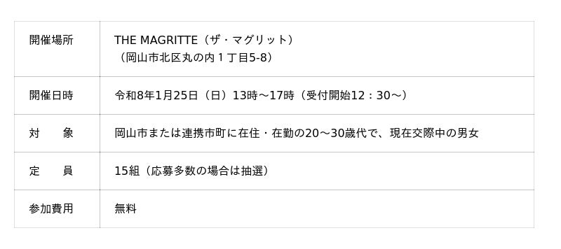令和7年度から岡山市及び連携市町(※)で、結婚を希望する若者を支援する「出会い・結婚サポート事業」に取り組んでいます。