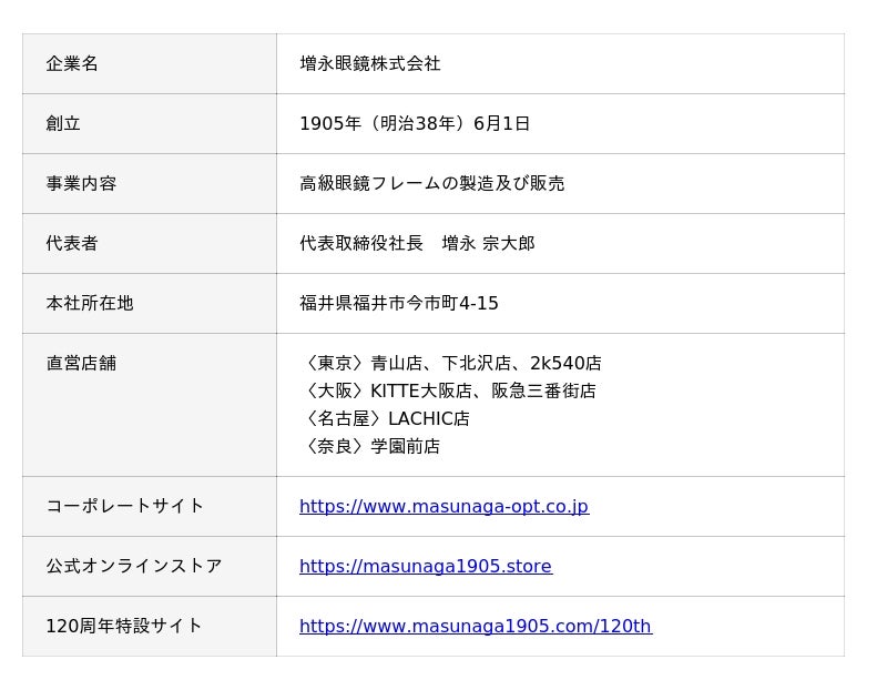 増永眼鏡は福井県福井市に本社を構える1905年(明治38年)創業のフレームメーカーです。創業者の増永五左衛門は豪雪地帯の福井に地場産業を築く夢を実現するため福井県で最初にめがね産業を興しました。「当社は良いめがねをつくるものとする。出来れば利益を得たいが、やむを得なければ損をしてもよい。しかし常に良いめがねをつくることを念願する」という社是のもと、たがいの技術を磨きあい、高品質で美しいめがねを提供しつづけてきました。これらデザインと機能性を兼ね備えためがねは今でも一貫生産で作られており、そのため幅広いジャンルのデザインを得意としています。増永眼鏡はこの品質第一主義をもとに、ヨーロッパ、アメリカ、アジアでの三極プロダクト構想を掲げ、国境を越えて時代と社会のニーズに応えながら、確実な足取りでステップを昇るグローバル企業です。