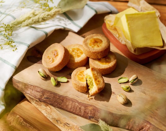 厳選した発酵バターを練り込んだサクサク食感の生地に、イタリア産ピスタチオのペーストを閉じ込めたガレット。ゲランドの塩がアクセントになって、自然なピスタチオの甘みが華やかに広がります。(本製品で使用しているバターのうち、48%が発酵バターです。)
