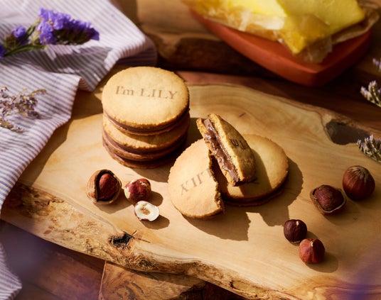 濃厚なヘーゼルナッツペーストを、フランスでつくられたミルクチョコレートで包み込み、バタークッキーでサンドしました。香ばしいヘーゼルナッツのコクと、チョコレートのまろやかさが重なり合う贅沢な味わいです。