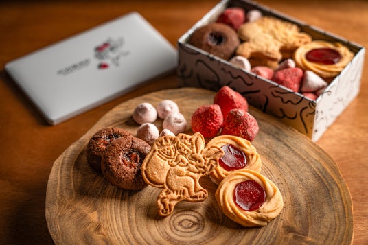 苺の自然な味わいを楽しめる自家製の「いちごのジャムクッキー」をはじめ、フリーズドライ苺にチョコレートを染み込ませた「いちごのしみチョコ」、優しい味わいとほろほろした口どけの「いちごのメレンゲ」など豊富なラインナップに。センターには、ICHIBIKOのアイコンであるうさぎの「ICHIBIKOロゴクッキー」も詰め合わせました。