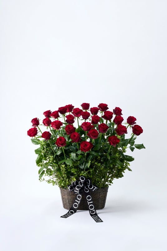 力強く伸びゆく深紅のバラが、洗練されたラインを描くパラレルアレンジメントです。凛とした佇まいの中に宿る情熱が、見る人の心を惹きつけます。高さと奥行きを生かした構成は、空間を華やかに彩り、祝福や感謝のシーンにふさわしい印象を与えます。ゴトウフローリストの象徴である赤いバラが放つ輝きが、永遠の美を語りかけます。