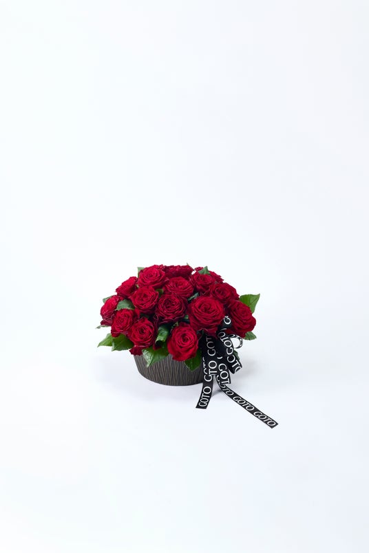 深紅のバラが円を描くように咲き誇る、優美なラウンドアレンジメントです。どの角度から見ても均整の取れたフォルムは、永遠の愛と調和を象徴します。上質な存在感と気品を備えたデザインは、大切な方への贈り物や特別な日の装飾として最適です。花々が織りなす豊かな色と香りが、空間に幸福感を満たします。