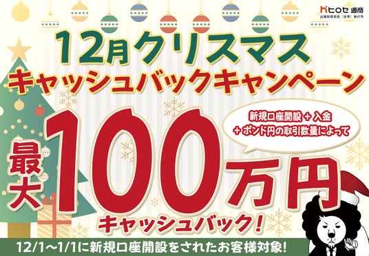 ヒロセ通商株式会社 (本社:大阪府西区、代表取締役:野市 裕作、以下:当社)は、当社の提供する「LION FX」において、2025年12月1日(月)より、「12月クリスマス最大100万円キャッシュバックキャンペーン!」を実施いたしましたのでお知らせいたします。