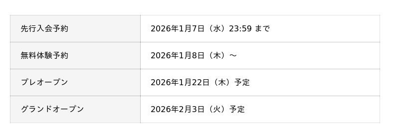 2026年1月7日(水)までに先行入会予約、かつ入会いただいた方にのみ最もお得な5大特典が適用されます。先行入会予約は、最新情報やお得な入会案内をメールにていち早くお知らせする無料登録のことで、予約フォームの入力で先行入会予約が完了いたします。