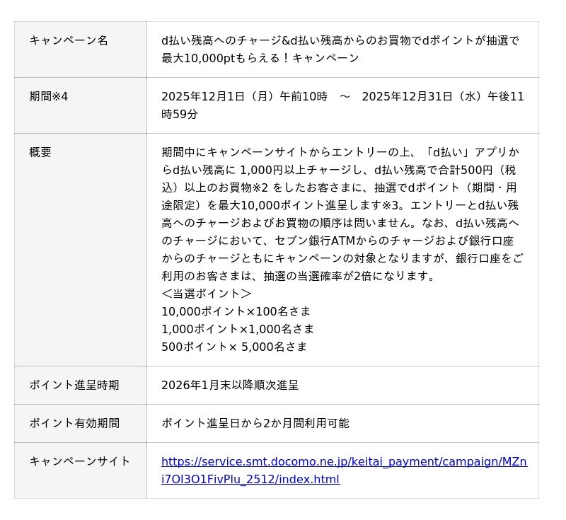 株式会社NTTドコモ(以下、ドコモ)は、「d払い残高へのチャージ&d払い残高からのお買物でdポイントが抽選で最大10,000ptもらえる!キャンペーン」を、2025年12月1日(月)から12月31日(水)まで開催します。