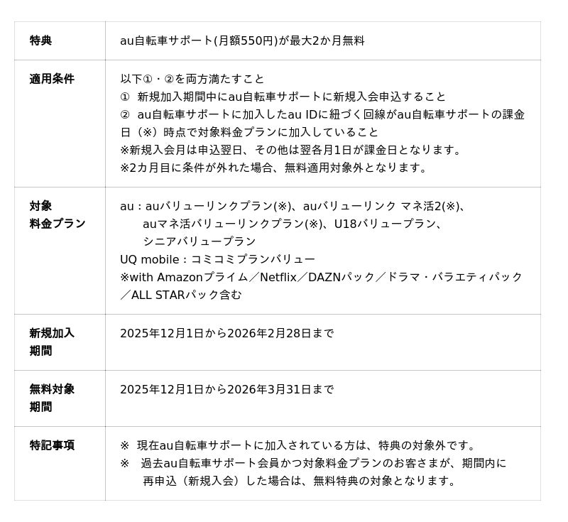 KDDIは2025年12月1日から2026年2月28日まで、「au自転車サポート 最大2か月無料!キャンペーン」(以下、本キャンペーン)を開催します。