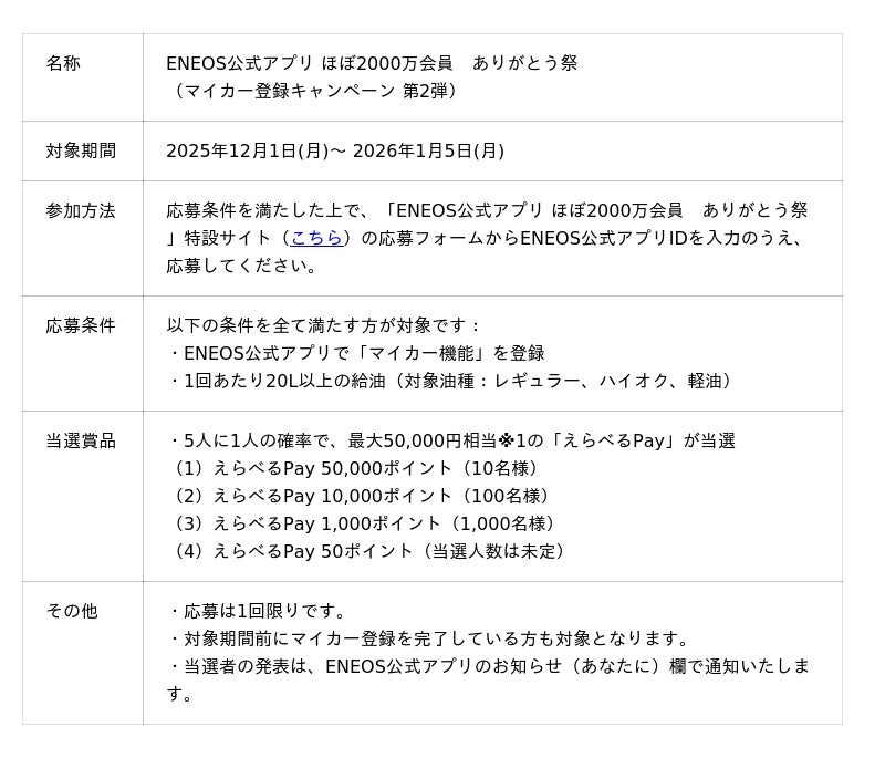 ENEOS株式会社(以下、「ENEOS」)は、2025年12月1日(月)から2026年1月5日(月)まで、ENEOSのサービスステーション(以下、「SS」)において、ENEOS公式アプリを利用し、「マイカー機能」登録をした上で給油された方を対象に、「最大50,000円相当※1のえらべるPay」が当たる「ENEOS公式アプリ ほぼ2000万会員 ありがとう祭」(以下、「本企画」)を実施しますので、お知らせいたします。