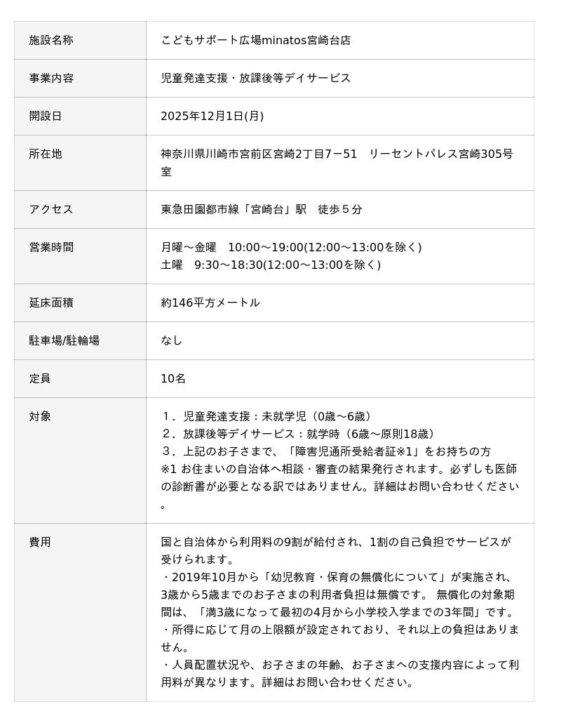 ヒューマンアカデミー株式会社の事業子会社で保育事業を展開するヒューマンスターチャイルド株式会社(本社:横浜市、代表取締役:川下 裕左、以下「当社」)は、2025年12月1日(月)、神奈川県川崎市宮前区に児童発達支援施設「こどもサポート広場minatos宮崎台店」を新たに開設いたします。