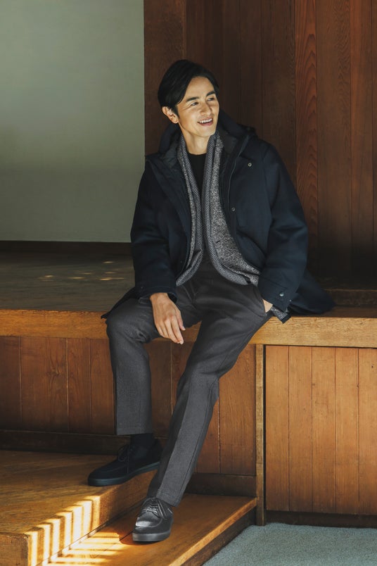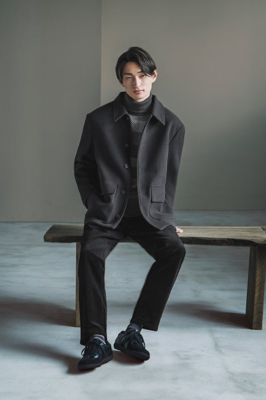 シンプルなモノトーンの装いには、ディテールや素材感でさりげない変化を加えたい。どこか懐かしい雰囲気のダッフルコートは、合成皮革のパッチで高級感を出し、縦横に使えるポケットなど、随所をモダンにアップデート。大ぶりな柄のセーターとコーデュロイパンツで、ひと味違ったベーシックカジュアルに。