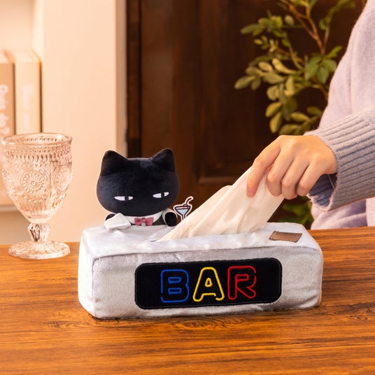 「黒猫マスター」のぷちっとしたサイズのぬいぐるみが付いたティッシュカバー。