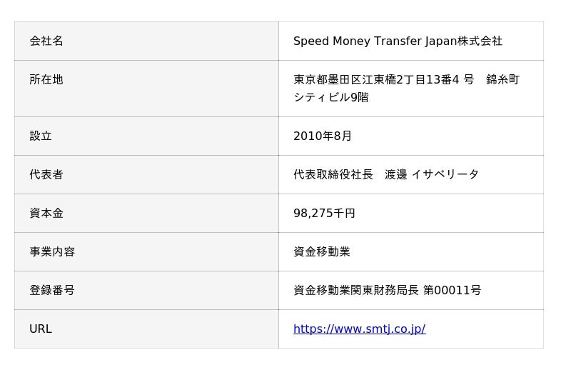Speed Money Transfer Japanは、外国人の郷里送金を主な対象として、フィリピン、インドネシア、インド、ネパール、ベトナムなどを中心に海外送金サービスを提供しています。海外送金は、モバイルアプリ、同社の4か所の本支店窓口や銀行振込、現金書留などの方法で送金ができます。受取人は現金受取センターや銀行窓口での現金受取、口座入金、食料品代金の決済、および利用可能な地域においては携帯電話のウオレットなどを通じてお受取りが可能です。また、モバイルアプリ「SPEED」に登録すると、送金履歴の確認などお客さまにとって安心で便利な機能がご利用いただけます。