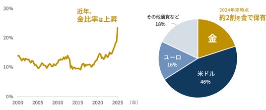 *時点:採掘量は2025年の推計、供給量は2010年~2024年 出所:ワールド・ゴールド・カウンシル 左グラフ期間:2000年3月末~2025年3月末、出所:FRB(米連邦準備制度理事会) 市場価格ベース 右グラフ時点:2024年12月末、出所:ECB(欧州中央銀行)市場価格ベース 上記は過去のデータであり、将来の結果を示唆あるいは保証するものではありません。