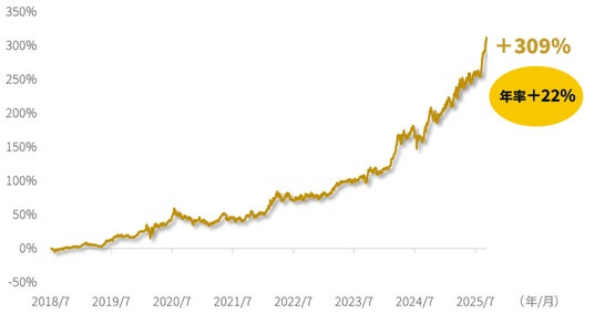 期間:2018年7月26日(設定日)~2025年9月30日、出所:ゴールドマン・サックス・アセット・マネジメント ETFの1口当たり純資産価格(NAV)ベースであり、運営費用(年率0.18%)は控除されています。米ドル・ベースの純資産価格をゴールドマン・サックス・アセット・マネジメントが円換算して表示しています。上記は運用戦略をご理解いただくためのご参考として表示したものであり、ゴールドマン・サックス・フィジカル・ゴールド・ETFの取得の勧誘を意図するものではありません。上記は本ファンドの実績ではありません。過去の運用実績は将来の運用成果を示唆あるいは保証するものではありません。