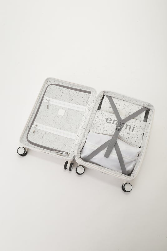 スーツケース内装左側にはファスナー付きディバイダー、ファスナー付き小物収納用ポケットを装備、内装右側には、荷崩れ防止のクロスストラップを装備しています。小物収納のファスナー付きビニールポーチは取り外しが可能です。内装にもemmiのロゴをあしらい、全体をホワイト&グレートーンでまとめています。