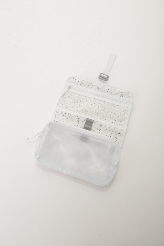 旅や出張で必要なコスメなどを収納可能。一時的に濡れたものを入れるのに便利なビニール素材も一部使用しています。