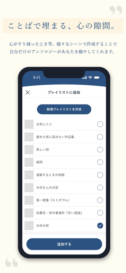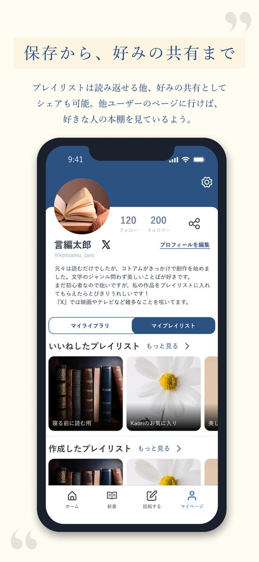 好きな作者はもちろん、素敵なプレイリストを作るユーザーもフォローが可能です。オールジャンルのことばが投稿される中で、一つのジャンルだけに絞ってじっくり鑑賞できます。