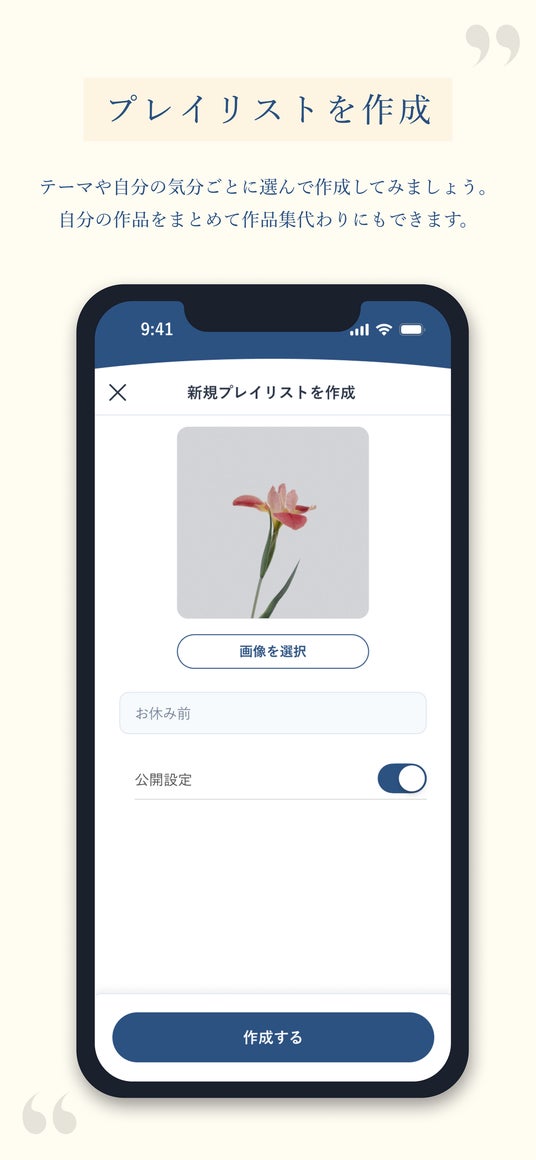 お気に入りの作品が見つかったら自分だけのプレイリストを作成し、何度も読み返すことができます。プレイリストには自分の作品を入れることもできるため、簡単に多くの人とシェアできる作品集になります。