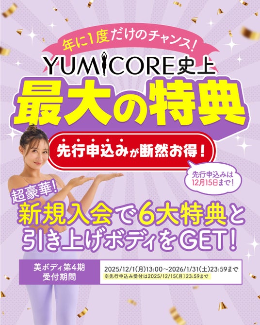 姿勢改善・ボディメイクメソッドを展開する株式会社YumiCoreBody(本社:東京都港区)は、オンラインレッスン年間契約プログラム「12ヶ月本気の美ボディプラン(以下:美ボディプラン)」第4期の新規受付を、2025年12月1日(月)13:00より開始しました。