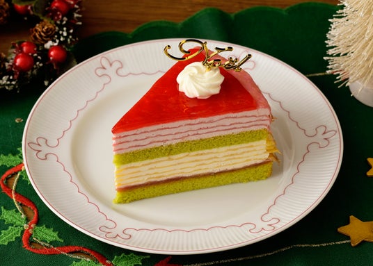 特長:苺グラサージュや苺クリームの赤と、抹茶スポンジの緑が鮮やかな、クリスマスカラーのミルクレープ。カスタード入りクリームを挟んだプレーンなクレープ5枚の上に、苺クリームを挟んだ苺風味のクレープを4枚重ねました。2種類のクレープとクリームの層が織りなす味わいをお楽しみください。