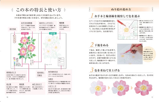 本シリーズの特徴は「塗りやすさ」。見開き左ページの着彩された色見本を見ながら、右ページで実際にぬり絵ができるので、初心者も手軽にぬり絵を楽しむことができます。