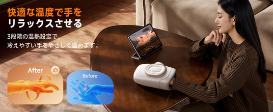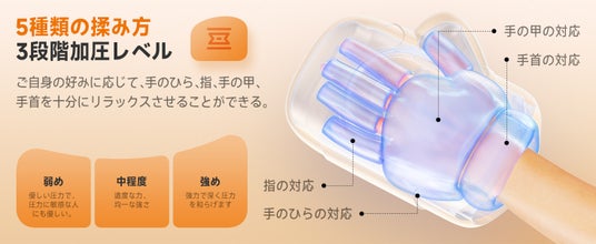 本製品は、手の曲線に沿ってエアバッグが密着するよう設計されており、手のひら・指先・手首までを包むようにケアします。