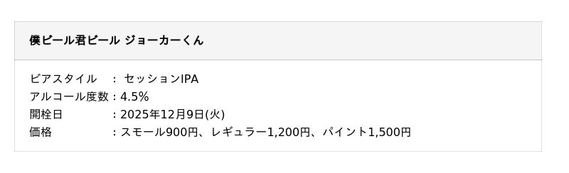株式会社ワンダーテーブル(本社:東京都新宿区西新宿、代表取締役社長:河野 博明)は、よなよなエール公式ビアレストラン『よなよなビアワークス』にて、数量限定ビール「僕ビール君ビール ジョーカーくん」(以下、ジョーカーくん)を2025年12月9日(火)より提供開始いたします。