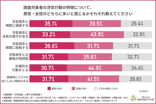 次に、「調査対象者の浮気行動の特徴について、男性・女性のどちらに多いと感じるか」を項目別に尋ねました。