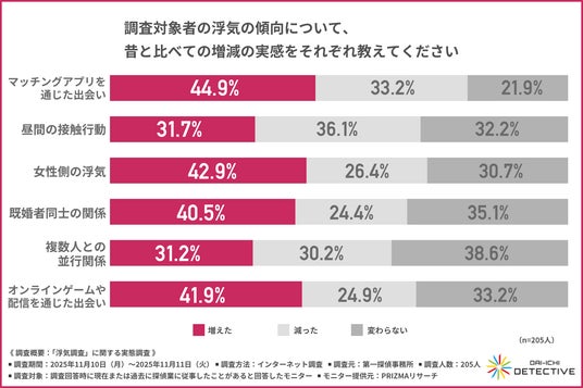続いて、「調査対象者の浮気の傾向について、昔と比べての増減の実感」を項目別で尋ねたところ、出会い方や形態はオンライン化・多様化が進んでおり、「マッチングアプリ」や「オンラインゲーム・配信」を通じた出会いが増加傾向にあることが示されました。匿名性の高さや手軽さが、倫理的な抑制を弱めていると考えられます。