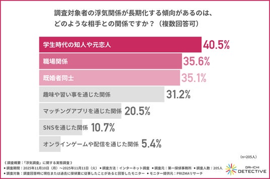 はじめに、「調査対象者の浮気関係が長期化する傾向があるのは、どのような相手との関係か」と尋ねたところ、『学生時代の知人や元恋人(40.5%)』と回答した方が最も多く、『職場関係(35.6%)』『既婚者同士(35.1%)』と続きました。