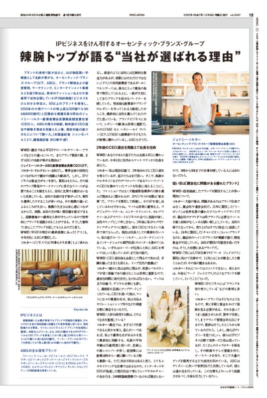 海外ニュースを紹介する翻訳ページでフォーカスするのは、欧米のファッション小売業界で台頭するIP(知的財産)ビジネスを牽引するオーセンティック・ブランズ・グループ。ジェイミー・ソルター創業者兼会長兼最高経営責任者(CEO)に同社の強さの秘訣や買収ブランドを選定する基準について聞きました。