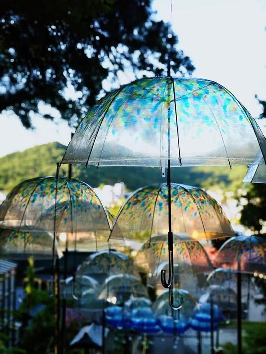 色彩と透明感が魅力の、青森の伝統工芸「津軽びいどろ」の風鈴をモチーフにした傘です。青森から全国に届けられ、多くの人に親しまれている伝統工芸「津軽びいどろ」の魅力を、2つの透明傘に表現しました。ガラスの揺らめきや風合いをイラストでていねいに再現し、傘を差して見上げると、まるで風鈴の内側に入ったかのような爽やかな世界が広がります。