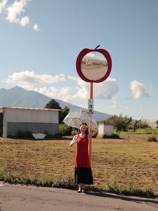 ねぶた柄の津軽びいどろ傘とりんごのカーブミラーがポップでかわいかったです!!りんご×びいどろ傘×岩木山という青森感満載の1枚でなんだかほっこりするお写真でした。