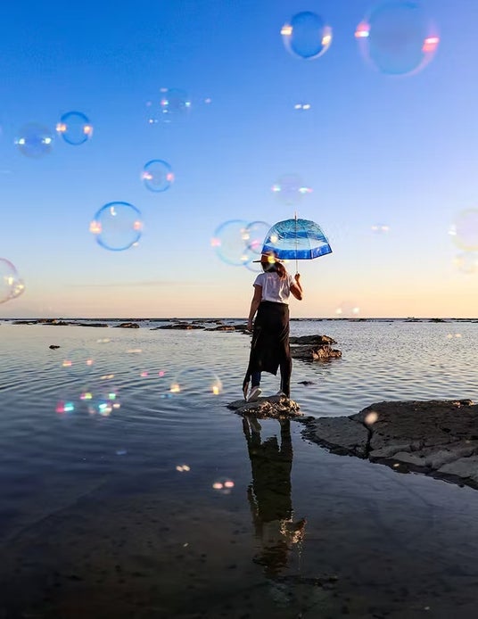 幻想的で柔らかな光の中で、空に舞うシャボン玉が、傘のテーマである風鈴の音色を視覚的に表現しているかのようです。傘をさして水辺に立つ人物の美しいシルエットと、津軽びいどろの風鈴傘の透明感が、夏の情景と独特の世界観を見事に調和させています。表現、色彩、テーマとすべてに於いて完成度の高い一枚です。