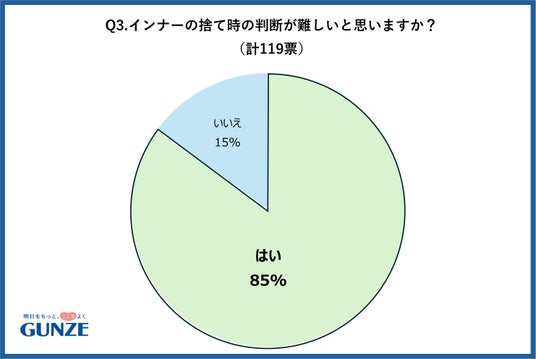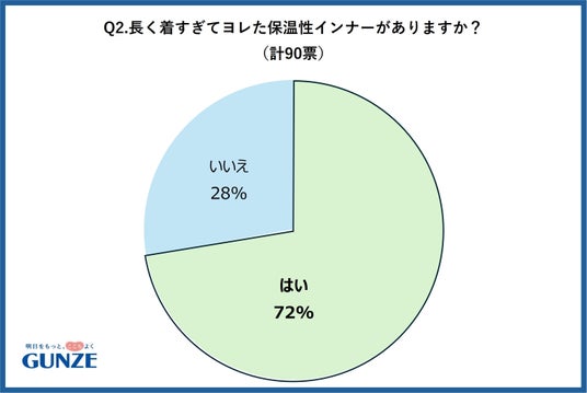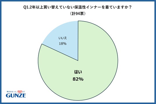 グンゼの公式Xを使用し、インナーの買い替えについてのアンケート調査を行いました。「2年以上買い替えていない保温性インナーを着ていますか?」という質問に対しては、『はい』と答えた人が82%でした。長く着すぎてヨレたインナーがある人は72%で、85%の人が捨て時の判断が難しいと答えているため、いつの間にか着古していることが多いようです。