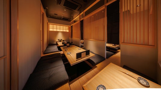 奥には 掘りごたつ式の座敷席(32席) をご用意。ゆったりと足を伸ばしながら、仲間やご家族とのひとときをお楽しみください。接待や会食、記念日など、さまざまなシーンに対応できる落ち着いた雰囲気です。