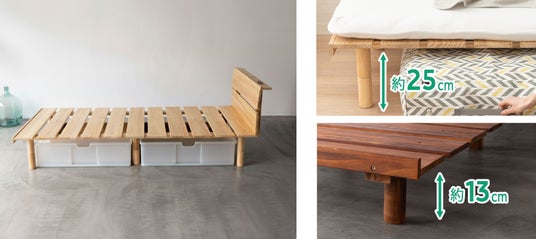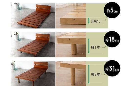 脚の付け外しによって高さを3段階に調節可能。敷き布団もマットレスも両方ご利用いただけるマルチベッドです。立ち上がりやすいハイタイプから、フロアライフまで対応しています。